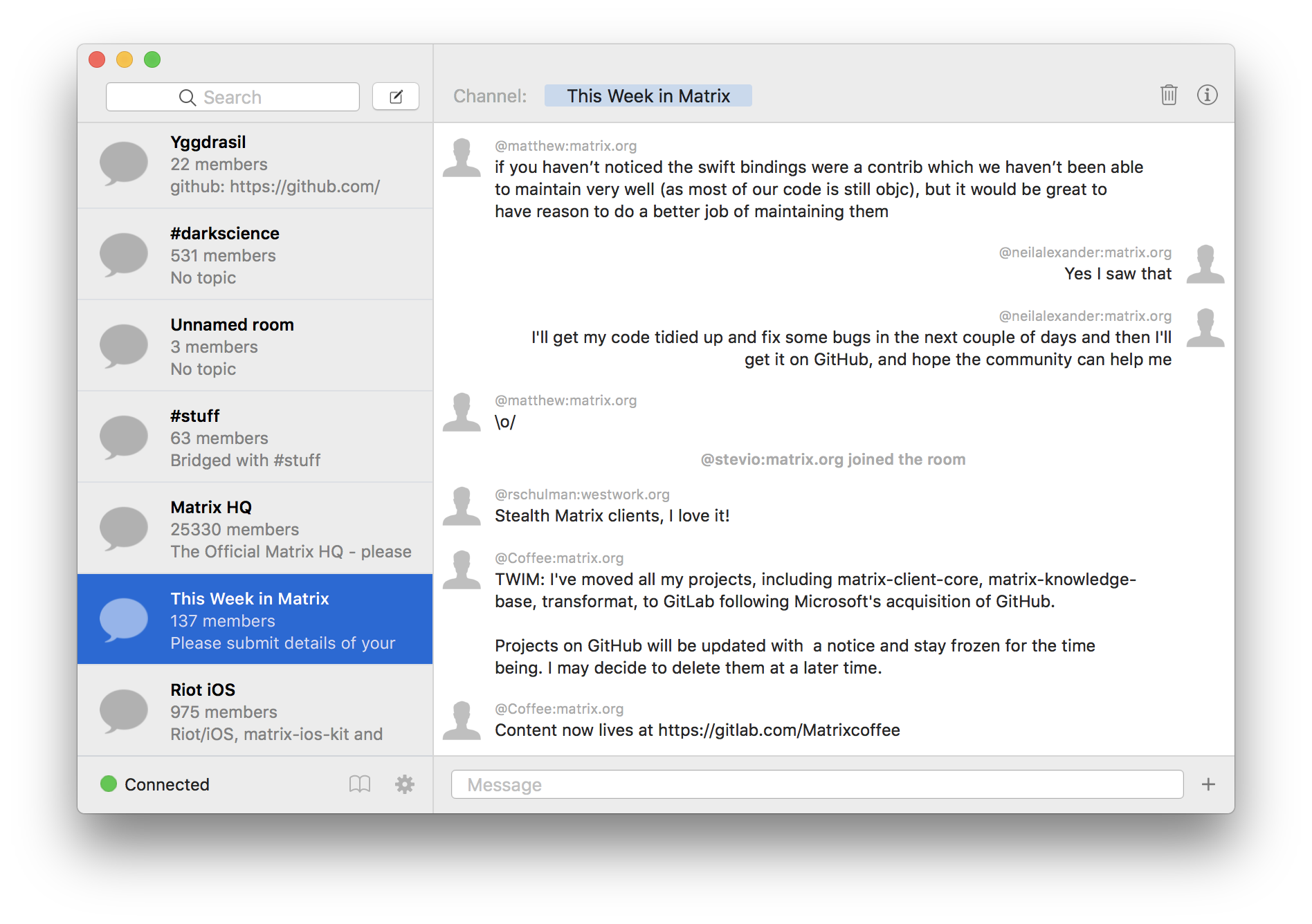 neilalexander has begun work on "seaglass", a client for macOS using matrix-ios-sdk, he's only just begun, but for now see the screenshot below: