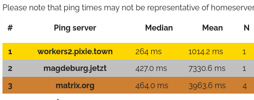 Here we reveal, rank, and applaud the homeservers with the lowest ping, as measured by pingbot, a maubot that you can host on your own server.