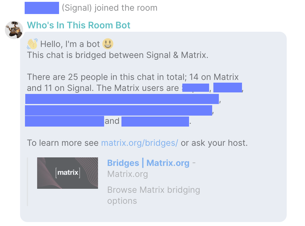 • Not show full Matrix usernames to Signal users (they can't use them). It will send their display name if it exists, otherwise their username prefix.